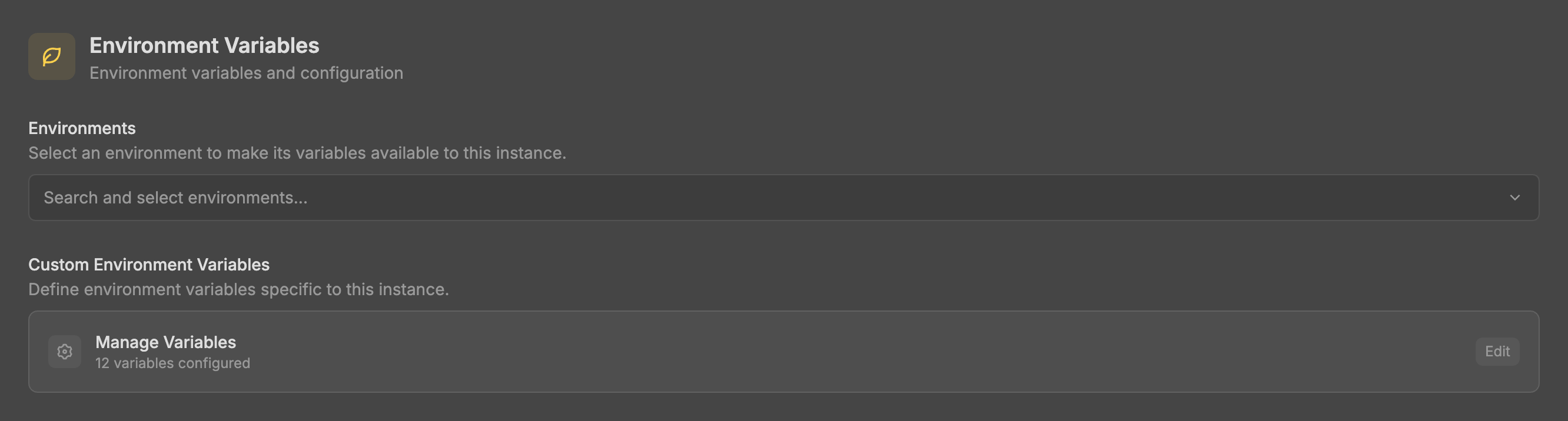Select one or more environments to make their variables available. Servers created from this config will inherit those variables automatically.